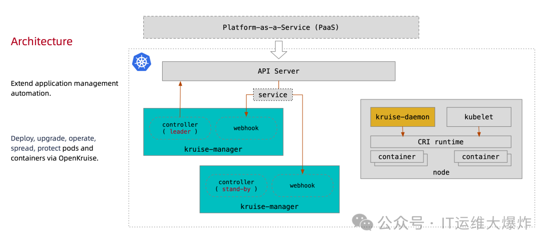 OpenKruise 由 Alibaba 开源,是 Kubernetes 的一个标准扩展,它可以配合原生 Kubernetes 使用,对云原生应用的自动化,比如部署、发布、运维以及可用性防护做了很多贡献。